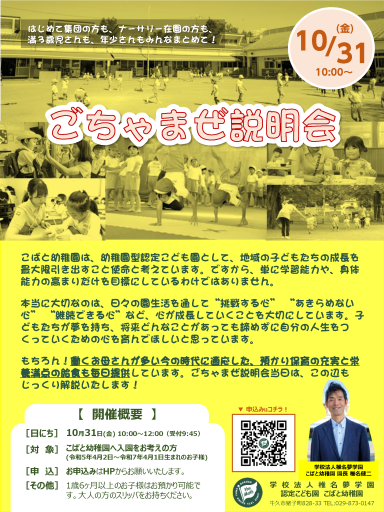 入園検討者向け「ごちゃまぜ説明会」10/31 に開催 2025/10/06 \ こばと幼稚園への入園にご興味をお持ちの方へ / 令和8年度4月に入園にご興味をお持ちの皆様、幼稚園の教育についてじっくり解説する「ごちゃまぜ説明会」を10月31日(金)に開催いたします。当日は、椎名夢学園の「夢育」について解説し教育についてご理解を深めていただくとともに、入園に向けた流れなどをお話させていただきます。はじめて集団の方も、ナーサリー在園の方も、満3歳児さんも、年少さんもみんなまとめて、入園にご興味のある方(令和8年4月1日時点で1歳~3歳の方)が対象です。※令和8年度の満3歳児クラス入園については、秋以降も、定期的に説明会を開催予定です。下記の開催内容をご確認の上、専用ページよりお申込みください。<開催概要>●開催日:10月31日(金)●時 間:10:00~12:00(9:45受付)●対 象:令和4年4月2日~令和7年4月1日生まれのお子様※ 1歳6ヶ月以上のお子様はお預かり可能です。※ 大人の方のスリッパをお持ちください。少しでもご興味のある方はどうぞお気軽にお申込みください。★お申込みはこちらhttps://kobato.ed.jp/inquiry/