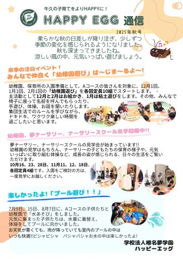 こんにちは!子育て支援「ハッピーエッグ」です。 “子育てに励むママ達を応援する場でありたい”という想いを込めて、「ハッピーエッグ通信」を季節ごとにお届けいたします。 日ごろの様子を知っていただき、足を運ぶきっかけにしていただければと思います♪ どうぞよろしくお願いいたします。![]()
