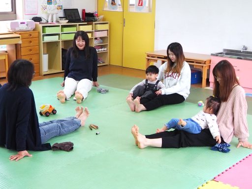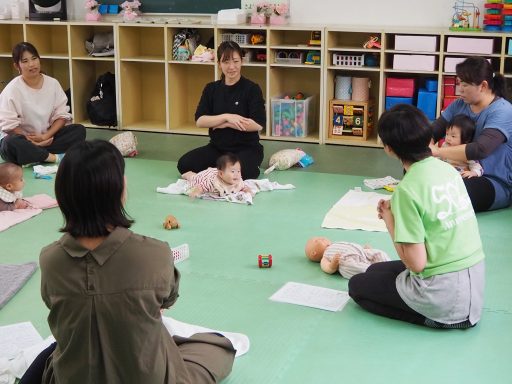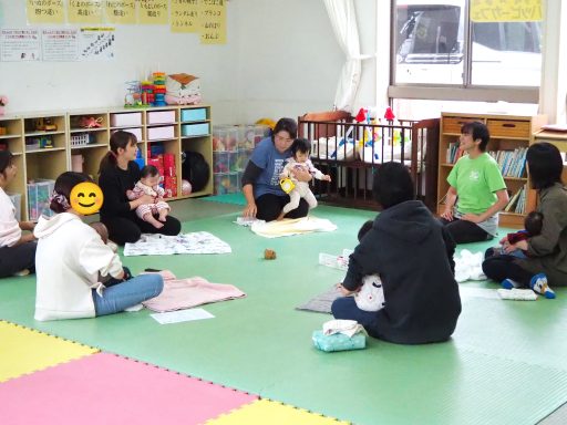 21日「ベビーマッサージ」には、もうすぐ2カ月になるお友だち、1歳1か月のお友だちなど6名の親子が来てくださいました。初めての方も来てくださり、ベビーマッサージの輪が広がってきています。今日はお子様の名前の由来をお話していただき、みんなで楽しくお話しながら、ゆったりとした時間を過ごしました。