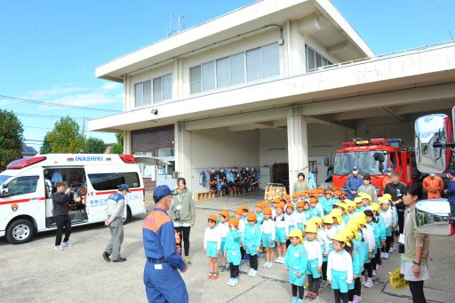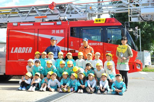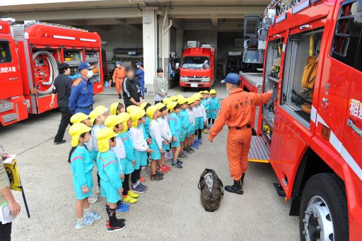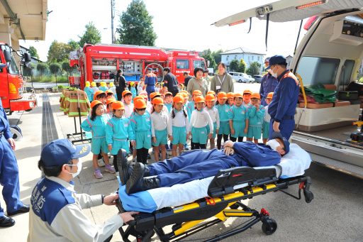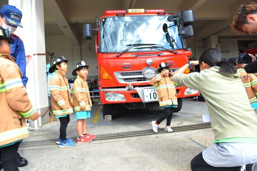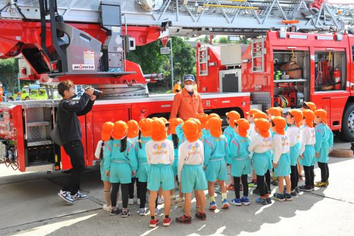 消防車や救急車、消防士さんが着る服やヘルメット、それと屋外の活動等を説明しながら見せてくれました。
