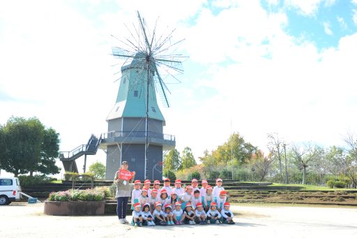 風車の前で記念写真を撮ってからどんぐり拾いをして、その後、公園の中をお散歩しました。