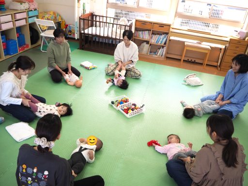 今週は「WARAリズム®︎寝返り準備」「ベビーマッサージ」「ナーサリー見学」を行いました。