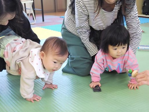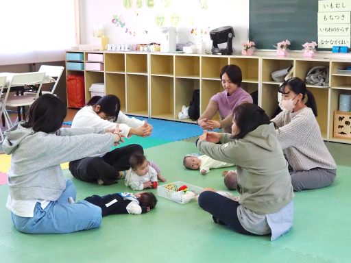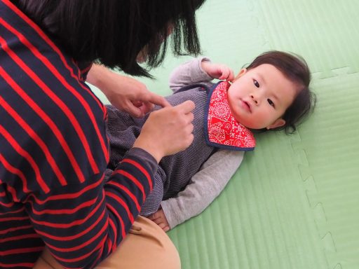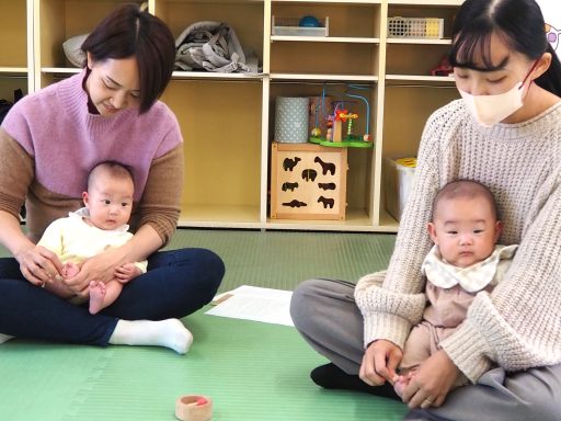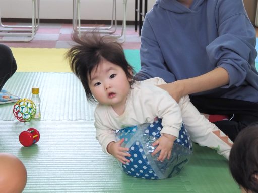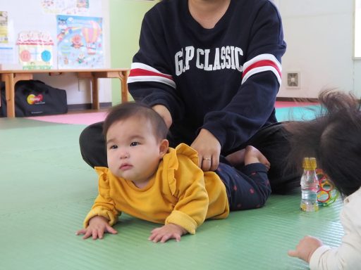今週前半は、3日続けてWARAリズム®を行いました。8日「寝返り準備」には4組の親子が、9日「はいはい・おすわり準備」には3組の親子が、10日「伝い歩き・歩行準備」」には3組の親子が参加してくださいました。