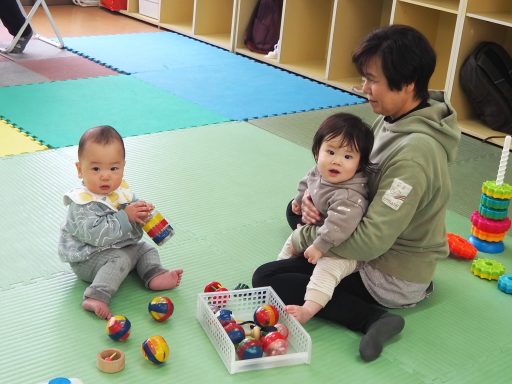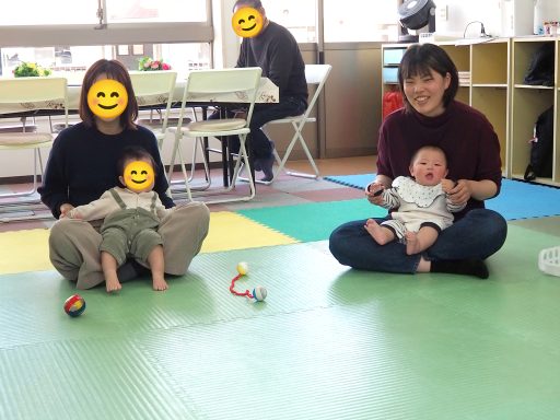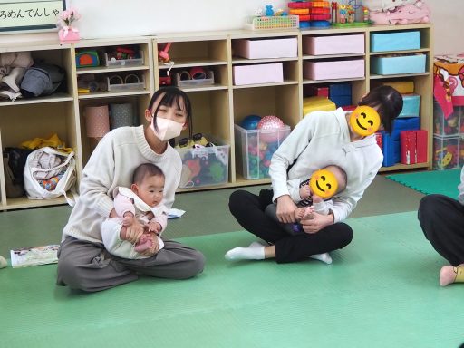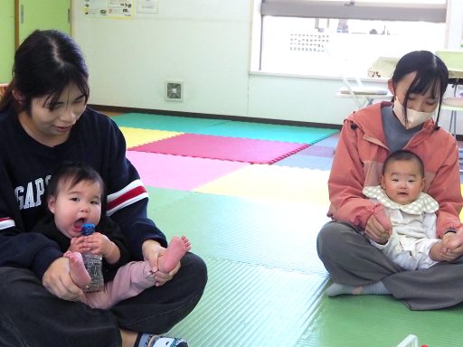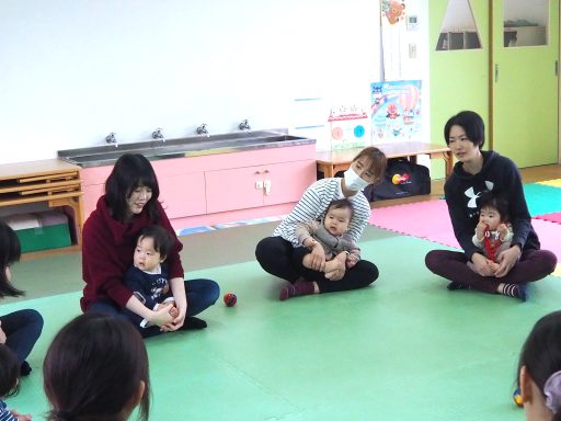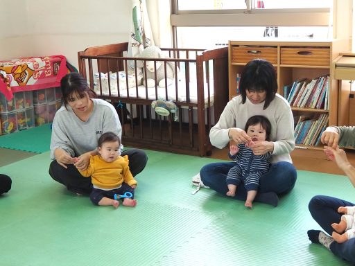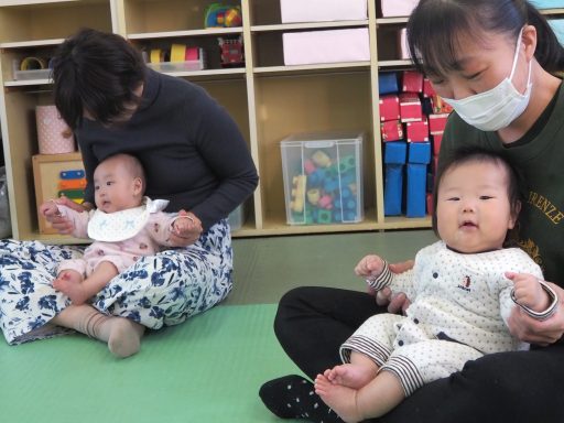 19日はWARAリズム、はいはいおすわり準備をしました。BコースとCコースの9組の親子が参加してくださいました。赤ちゃんの運動発達についてお話しをしてから、だるまさん、餅つきなどのWARAリズムを楽しみました。はいはいをしたり自分でお座りをしたり、自分の身体を自由に動かすことができると楽しいですね。これからも、床の上でたくさん遊びましょう!