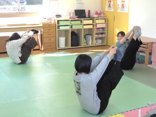 皆さん先生のお話に一生懸命耳を傾けて、気持ち良くご自分の身体を動かしていました。子供達は男の子4人。車が大人気で代わりばんこに楽しく遊びました。