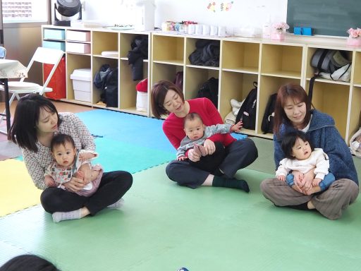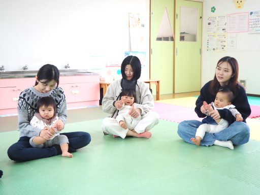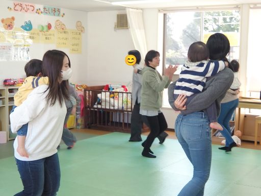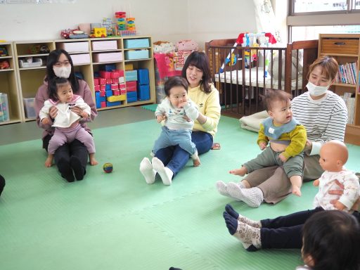 28日はWARAリズムの伝い歩き、歩行準備をしました。これから歩き始めるお友だちから上手に歩いているお友達だちまで、9組の親子が参加してくださいました。みんな笑顔で楽しい会になりました。